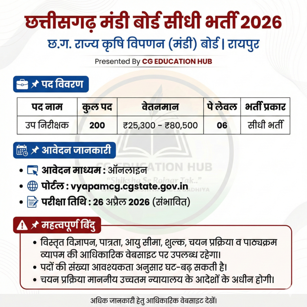 CG Vyapam Mandi Nirikshak Bharti 2026: छत्तीसगढ़ राज्य के युवाओं के लिए छत्तीसगढ़ व्यापम मंडी उप निरीक्षक भर्ती 2026 एक बड़ी और प्रतिष्ठित सरकारी भर्ती मानी जा रही है। यह भर्ती छत्तीसगढ़ राज्य कृषि विपणन (मंडी बोर्ड) के अंतर्गत आयोजित की जाएगी, जिसका संचालन छत्तीसगढ़ व्यापम द्वारा किया जाएगा।इस भर्ती का मुख्य उद्देश्य राज्य की कृषि मंडियों में पारदर्शिता, अनुशासन और सुचारू प्रशासन को मजबूत करना है। यदि आप स्नातक (Graduation) पास हैं और राज्य सेवा में स्थायी नौकरी की तलाश कर रहे हैं, तो यह अवसर आपके करियर को नई दिशा दे सकता है।